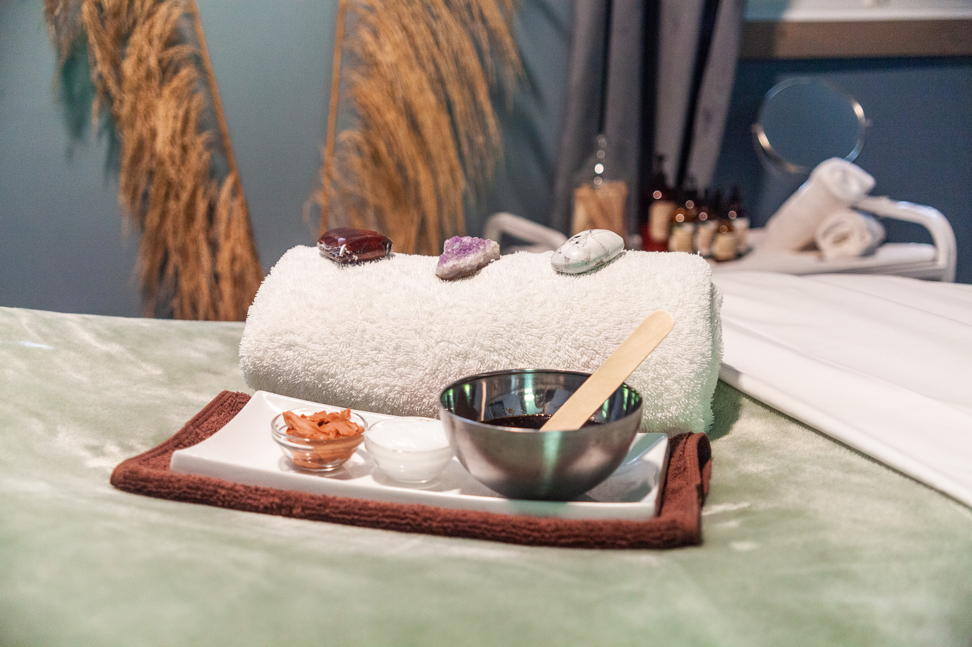 Dry brushing using lymphatic drainage techniques to stimulate circulation and detoxify the body. Followed by a sea salt scrub to improve the texture and circulation as well as promote deeper penetration of the hydrating rose clay once applied. Tension relieving scalp massage and hair manipulation. Hot towels applied to the feet, followed by a rinse off on the shower. Returning to the massage table for effleurage application of nourishing moisturizer.